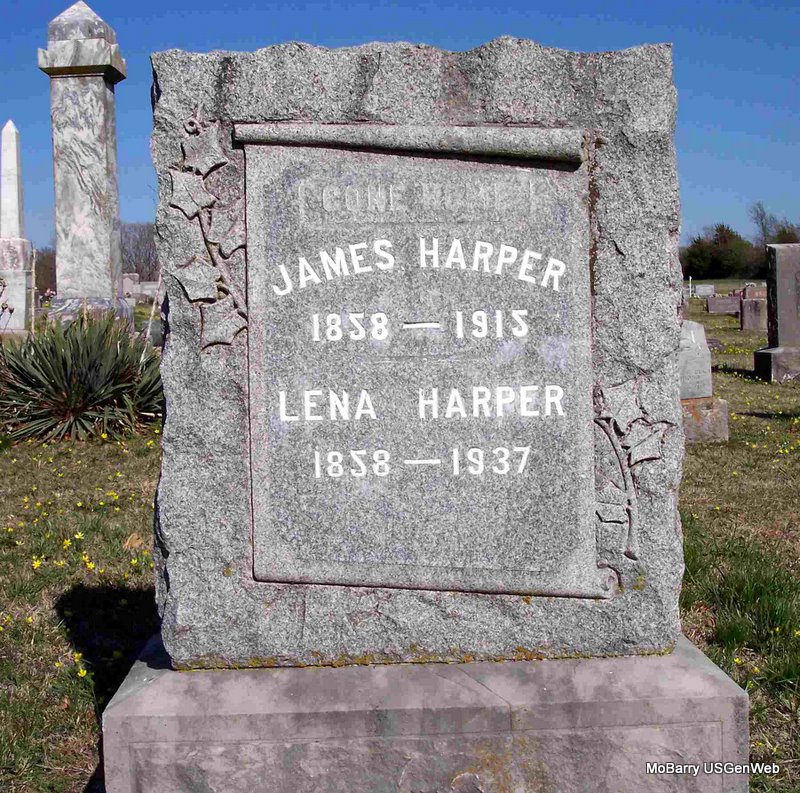 SSW: Lena - Research Note: He was the son of Peter Harper and Sarah Saunders. - Cassville Republican, Dec. 30, 1915 - James Harper was born in Sandusky, Ohio, February,17, 1858. Died Dec. 24, 1915, age 56 years, 10 months and 7 days. He moved with his parents to Delaware County, Iowa. Became a Christian in the spring in 1891 and united with the M. E. Church. He was married to Miss Lena Becker, September 10th, 1891. To this union were born three children: Harold James, Royal Clarence and Ethel Lena. He leaves a wife, three children, one brother, A. P. Harper, of near Butterfield, one sister, Ella Richmond of Rathdrum, Idaho, one aunt, Mrs. Epsie Griggs, of Lincoln, Nebraska, and a host of friends. He was the pioneer canner and fruit grower of this part of the county, starting the first cannery in the county about 1902. | Online Obit Death Certificate Phyllis Long Photo Diana Cope |