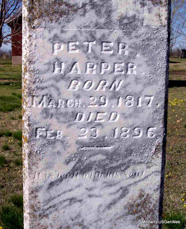 Research Note: Peter sailed from Liverpool, England on June 11, 1849. Landed at New York, New York on July 15, 1849. Moved to Butterfield, Missouri in December 1895. He came down with "La Grippe" in February 1896 and died after two weeks. He first married Mary Woods in England, second Julia Ann Williams in OH, and third Sarah Saunders in OH. Sarah second married Mason Combs and is buried at Mt. Pleasant Cemetery under Combs. | Family History Dennis Arter Note Phyllis Long Photo Diana Cope |