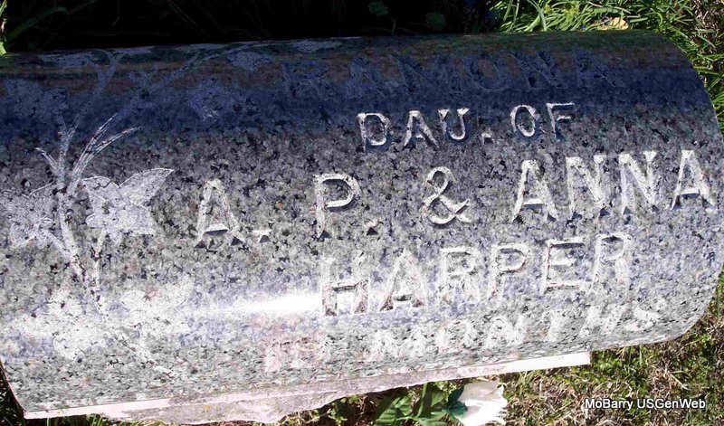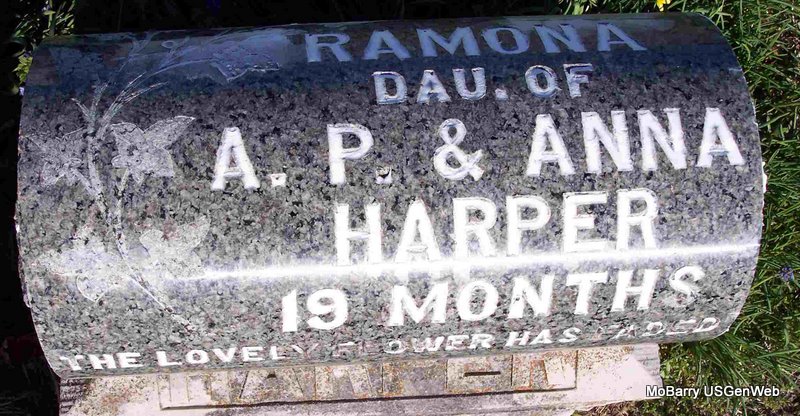 | HARPER, Rose Ramona | Apr. 7, 1906 | Nov. 7, 1907 | Inscription: "19 Months - Dau. of A. P. and Anna" - Research Note: Albert Peter and Charity Ann (Lane) Harper were the parents. Charity Ann was also married William Kanada McComas. - Another Photo | Note Donna Cooper Photo Diana Cope |