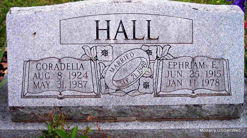 | HALL, Coradelia | Aug. 8, 1924 | May 31, 1987 | SSW: Ephraim E. - Inscription: "Married Sept. 21, 1940" | Photo Diana Cope |