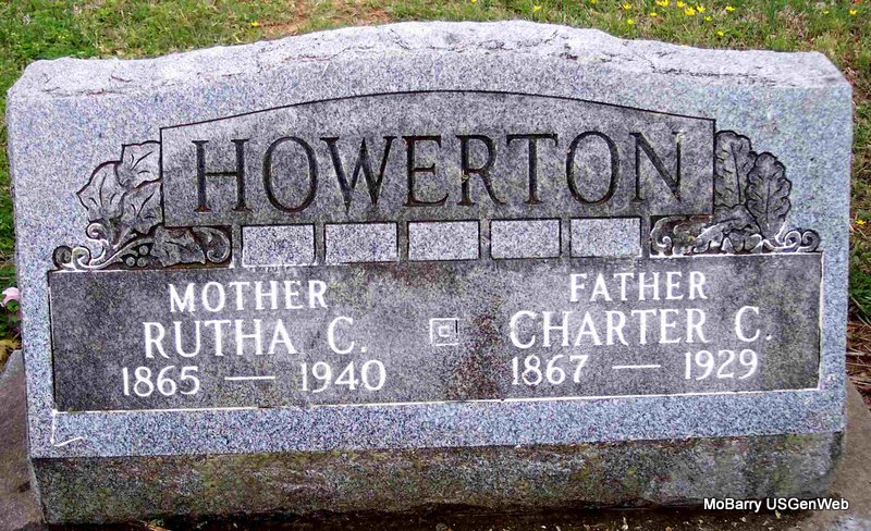 SSW: Charter C. Howerton - Research Note: She was the daughter of John H. and Emmeline Stephens. - Ruth Caroline Stephens, daughter of the late John H. and Emmaline Stephens, departed this life at the home of her daughter, Mrs. Maymie Sherman, at the age of 75 years, 7 months and 28 days. She was united in marriage to Charles C. Howerton, June 3, 1888. To this union four children were born, Her husband preceded her in death, Apr. 20, 1929, and an infant son, June 20, 1905. She was converted in early life at the Concord church and later united with the New Hope Baptist church, where she remained a faithful and devoted member until death. The family resided in the New Hope community, east of Wheaton, for many years. "Aunt Ruth" Howerton, was one of the sweetest women ever. Those who knew her will be blessed to have shared her happiness and charm, She was a mother to all who needed her help. Her mission in life was to give to others the happiness and helpfulness of her life. She is survived by her daughter, Mrs. Maymie Sherman of Osawatomie, Andy and Corum Howerton of Purdy, MO, and seven grandchildren: Aubrey of the home address, Irene, Mary Helen, Catherine, Margaret, John and Rebecca Ann of Purdy, MO, and a host of friends and neighbors. Funeral services were held at the New Hope Baptist church on Wed. afternoon, Nov. 6, 1940, by the Rev. Charles Vanzandt and the Rev. Charles McNabb. Burial was in the Mt. Pleasant Cemetery, under the direction of the Blankenship funeral service. - Howerton Family Photo | Brother's Obit Findagrave Obit Phyllis Long Headstone Kay C. Morrow Photo Diana Cope |