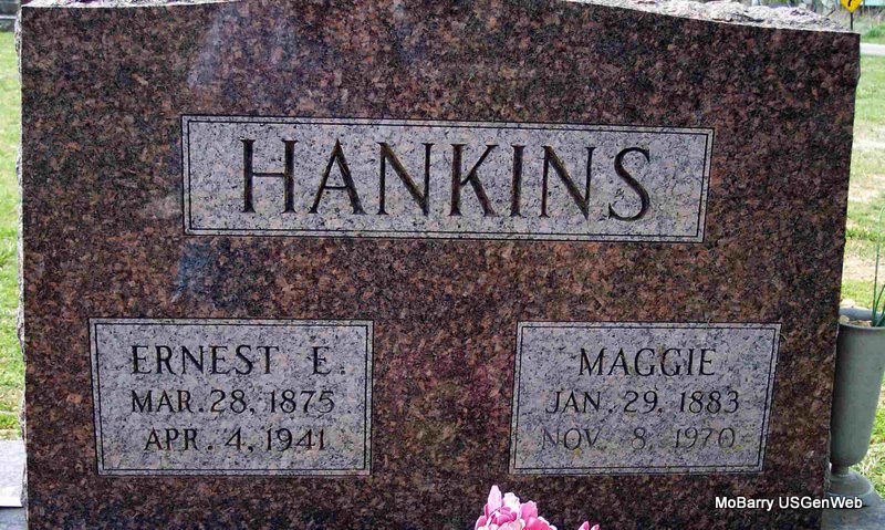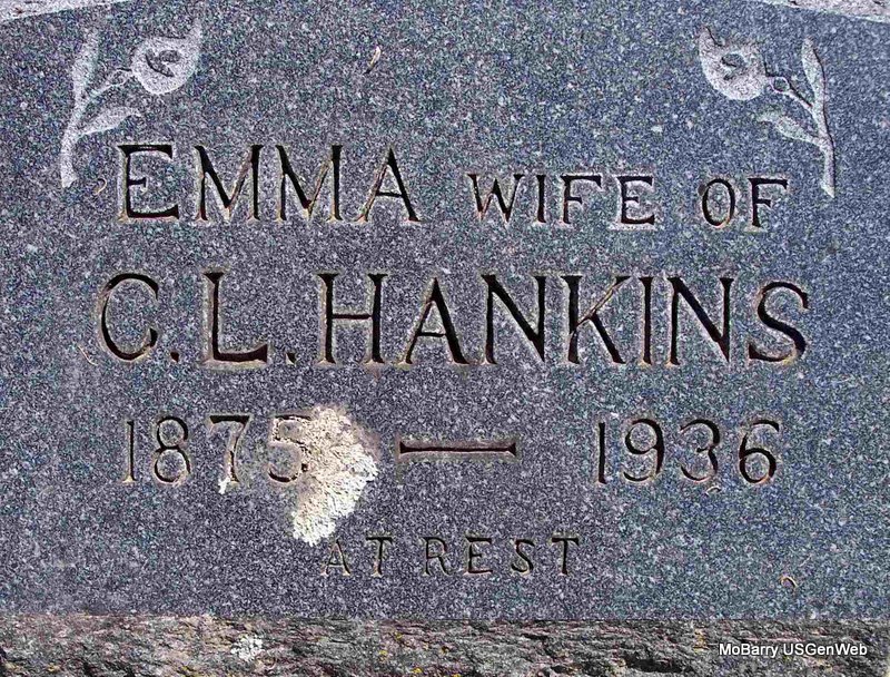 Inscription: "Wife of C. L. Hankins" - Research Note: Emma was a daughter of James Preston and Samantha Carolina (Long) Burchett. She married Charles Love Hankins, June 9, 1900 in Barry County, MO. Mrs. Ernest Hankins was the informant on the death certificate. | Family History Donna Cooper Death Certificate Phyllis Long Photo Diana Cope |