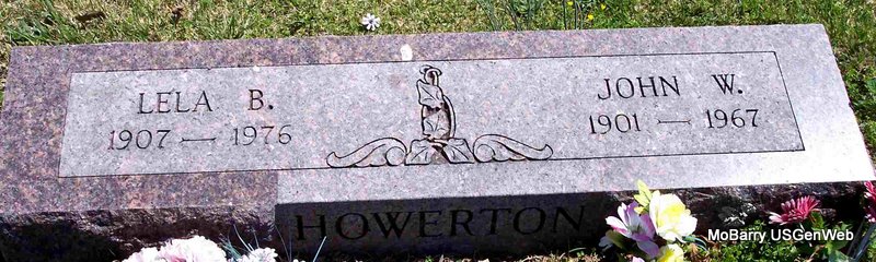 SSW: Lela B. - Research Note: He was a son of James Monroe and Hettie (Drinkwater) Howerton. His wife Lela was the informant. They lived in Butterfield, Barry Co., MO. - 1930 Census, Independence, Montgomery Co., KS - J. W. (John William) Howerton, age 29, married at age 24, born MO, father born MO, mother IN; Lela, wife, age 23, married at age 18, born OK; Bill, son, age 4, born KS; James Robert, son, age 2, born MO. | Note Donna Cooper Census Death Certificate Phyllis Long Headstone Kay C. Morrow Photo Diana Cope |