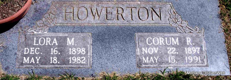 | HOWERTON, Lora Mamie (COUNTS) | Dec. 16, 1898 | May 18, 1982 | SSW: Corum R. Howerton - Research Note: She was the daughter of John A. Counts and Nancy Lucinda Drake. - Cassville Republican, June 20, 1918 - Corum Howerton and Miss Mamie Counts of Purdy were married at Purdy June 10. They come from good families and have the wishes of a large circle of friends for a long and happy life. - MO Marriage Records give their ages as both 19. | Online Newspapers MO Marriage Records Phyllis Long Headstone Kay C. Morrow Photo Diana Cope |