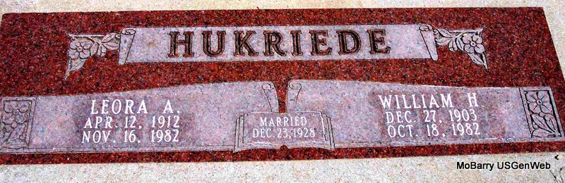 | HUKRIEDE, William H. | Dec. 27, 1903 | Oct. 18, 1982 | SSW: Leora A. - Inscription: "Married Dec. 23, 1928" - Research Note: 1925 Census, Swede Creed, Riley Co., KS - William, age 25 is living with his uncle August Hukriede and family. - 1930 Census, Morgan Co., CO - William Hukriede, age 26, married at age 24, born Germany, parents born Germany, immigrated to US in 1924, farm hand; Leora, wife, age 20, married at age 18, born KS, parents born KS. | Census Phyllis Long Photo Diana Cope |