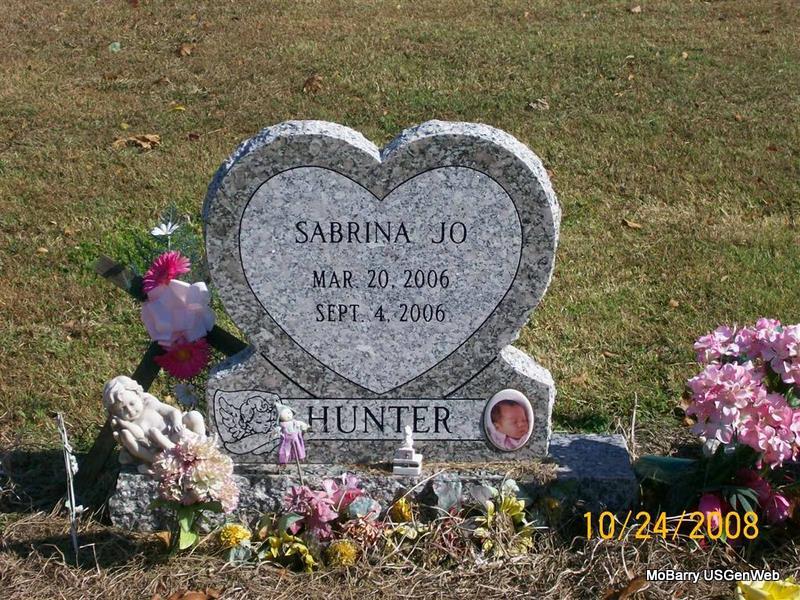 | HUNTER, Sabrina Jo | Mar. 20, 2006 | Sept. 4, 2006 | Research Note: Five month old daughter of A. J. Hunter and Jessica Ingle. She was preceded in death by her maternal great grandfather, William Hasten; maternal great grandparents, Charles and Jeannie Mitchell; paternal great grandfather, Samuel Hunter; and paternal great grandmother, Pauline King. | Fohn Funeral Home Phyllis Long Photo Jay Trace |
