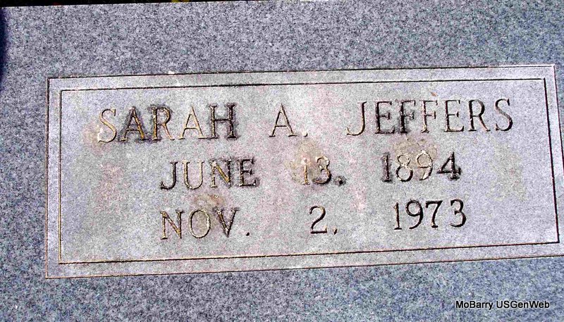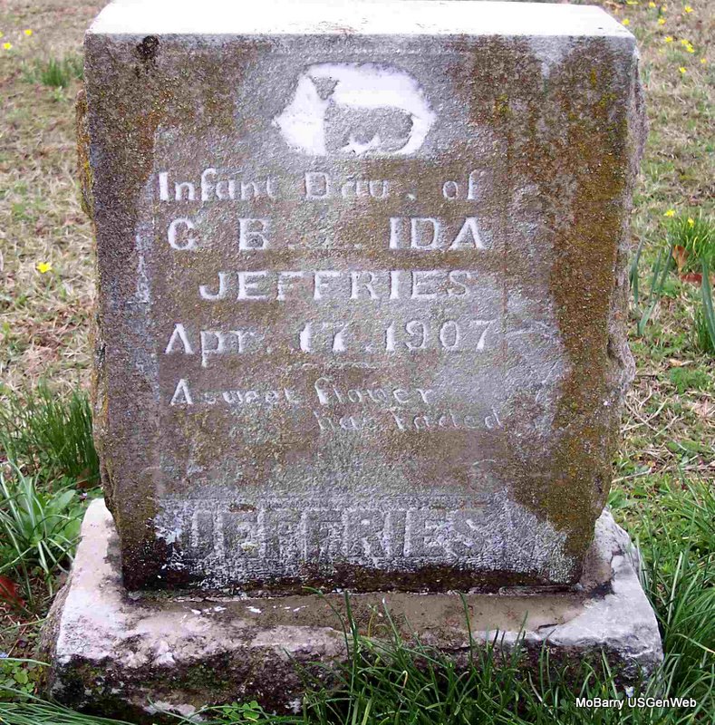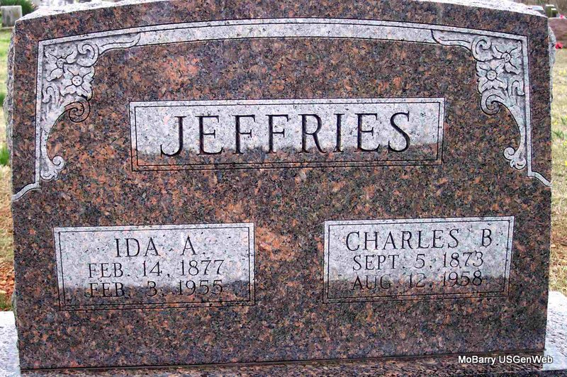 | JEFFERIES, Ida A. (TUCKER) | Feb. 14, 1877 | Feb. 3, 1955 | SSW: Charles B. Jefferies - Research Note: Married June 7, 1895 in Cassville, Barry Co., MO. She was the mother of Conn L., Norris C., and an unknown infant. Her parents were John Albert Tucker and Harriet Combs. Her maternal grandparents were Mason Calmes Combs and Margaret Elvira Hogan. Paternal grandparents were John W. Tucker. and Mary Alice Stephens. | Census Phyllis Long Headstone Cheryl Photo Diana Cope |