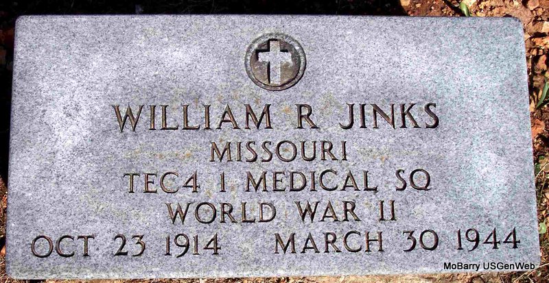 Inscription: "MISSOURI TEC4 MEDICAL SQ WORLD WAR II" - Research Note: He was the son of George Robert Jinks and Elsie Mary Anderson. Husband of Helen Ruth Russell; married on December 8, 1942 in Ft. Worth, Tarrant County, Texas. Killed In Action during the Admiralty Islands Campaign (Operation Brewer), New Guinea. | Nara.gov Census Phyllis Long Photo Diana Cope |