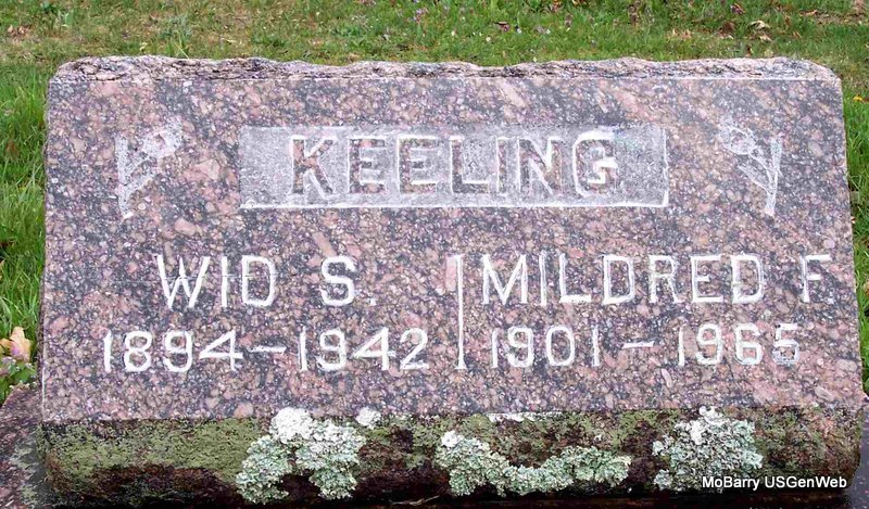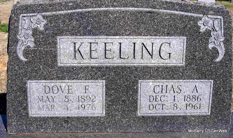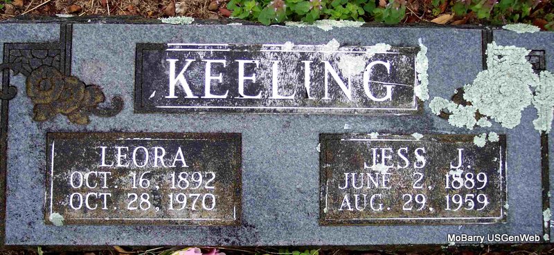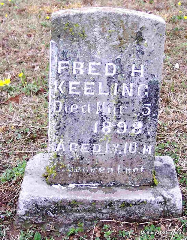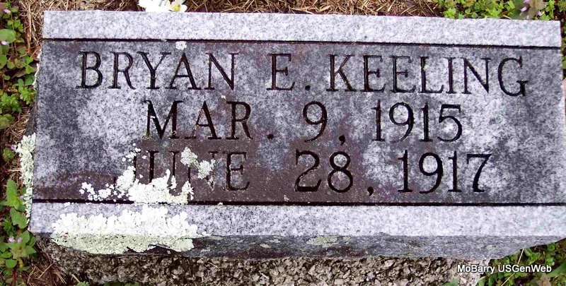 SSW: Mildred F. - Research Note: His given name was William Samuel. He was the son of James Monroe Keeling born TN and Ann Edens born TN. His wife was the informant on the death certificate. - November 17, 1917, Saturday, Cassville Democrat - Wid Keeling vowed by the length of the long toe string and the width of the old tin pan that he would break up bachelor's ball good and plenty. Accordingly he brought a Miss Fry to town last Saturday and promised to be her's truly all the days of his life. Home they went but they are expected to be out again in the near future if nothing happens. | Death Certificate Phyllis Long Headstone Kay C. Morrow Photo Diana Cope |