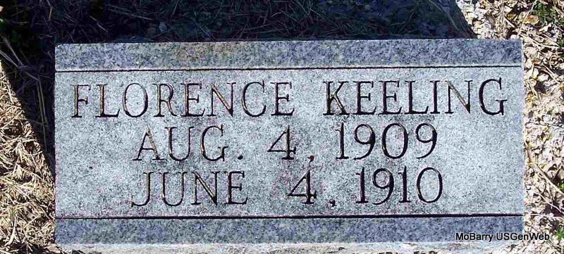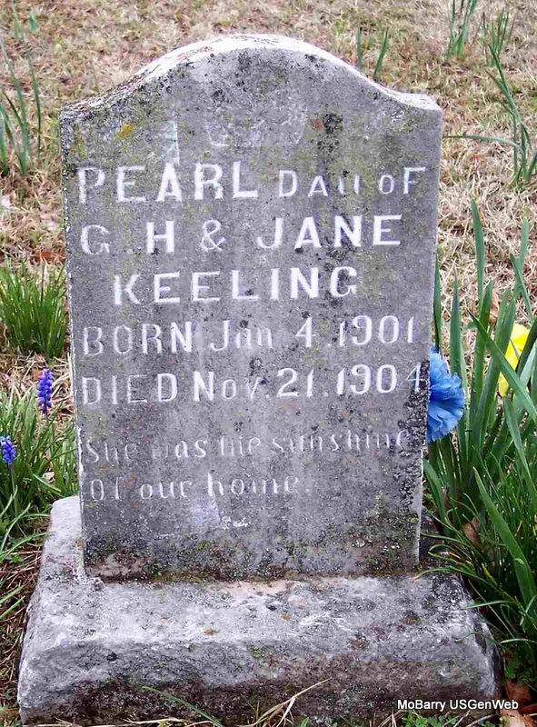 | KEELING, Pearl | Jan. 4, 1901 | Nov. 21, 1904 | Inscription: "Daughter of G. H. and Jane Keeling" | Headstone Kay C. Morrow Photo Diana Cope |