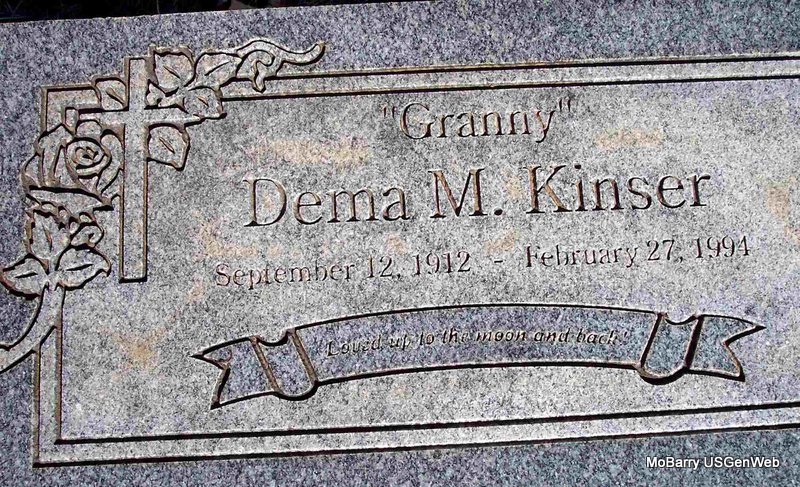 | KINSER, Dema Mae (HENLEY) | Sept. 12, 1912 Jenkins, Barry Co., MO |