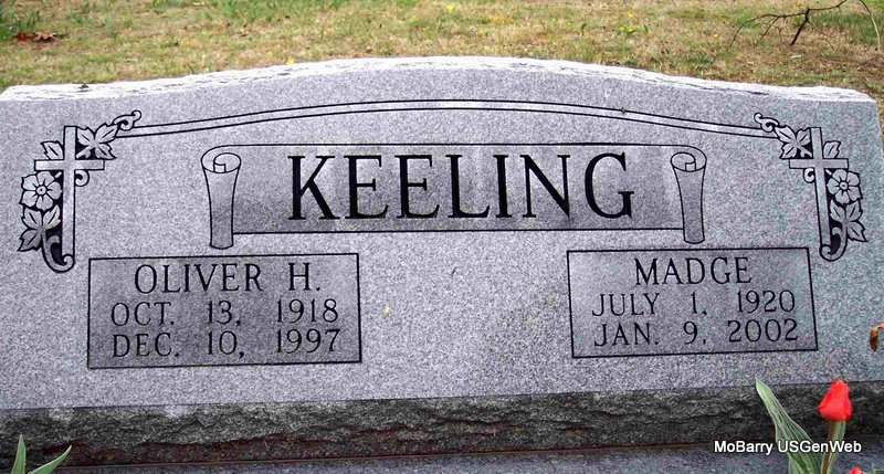| KEELING, Oliver Hugh | Oct. 13, 1918 | Dec. 10, 1997 | SSW: Madge Keeling - Research Note: He was the son of Jess John Keeling and Eliza Leora Jones. | Sister's Obit Phyllis Long Headstone Cheryl Photo Diana Cope |