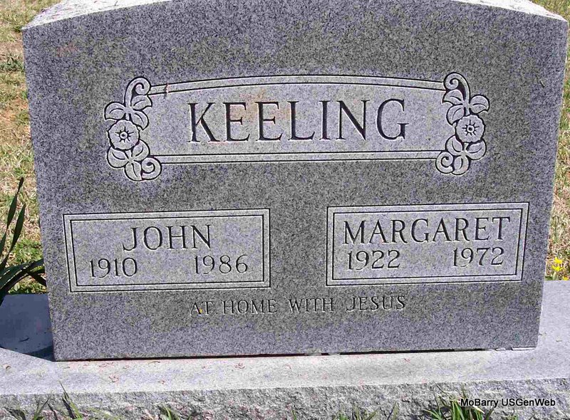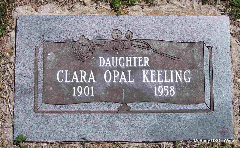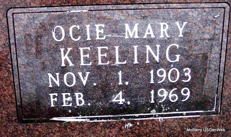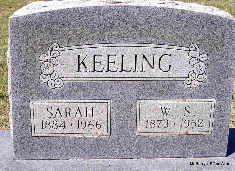 SSW: Sarah Keeling - Research Note: Parents not named on the death certificate and it has born Sept. 1, 1873 and died Dec. 26, 1952. John Keeling of Cassville, MO was the informant. He was the son of John Dudley Keeling and Mary Ann Rhoden. | Death Certificate Phyllis Long Headstone Kay C. Morrow Photo Diana Cope |