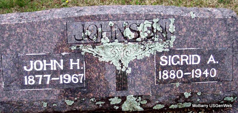 SSW: Sigrid A. - Research Note: 1910 Census they are in Omaha Ward 6, Douglas, Nebraska. - 1930 Census, Butterfield, Barry, Missouri - John H. Johnson, head age 53, married at age 28, born Sweden; Sigred wife, age 50, married at age 25, born Sweden; Alfred, son, age 20, born NE; Thursa, daughter, age 19, born NE; Eric, son, age 17,, born NE; Thyra, daughter, age 16, born NE; Andrew, son, age 8, born NE; Anna, daughter, age 8, born NE. - 1940 census, they are in Gallatin, Clay, Missouri. | Census Phyllis Long Photo Diana Cope |