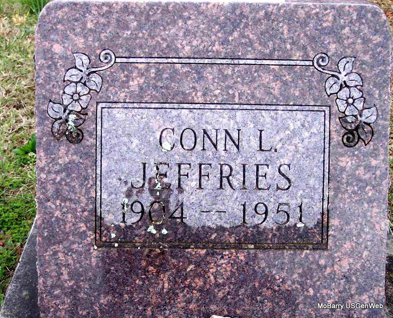 | JEFFERIES, Conn L. | Aug. 8, 1904 | Aug. 29, 1951 | Research Note: He was the son of Charles B. Jefferies and Ida A. Tucker. He married Mildred Gillmore. | Census Phyllis Long Headstone Cheryl Photo Diana Cope |