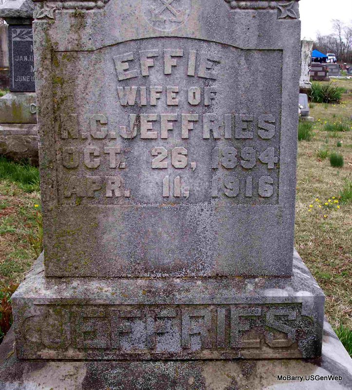 Inscription: "Wife of N. C. Jeffries" - Research Note: Death certificate has born Oct. 26, 1896 and died Apr. 11, 1917. She was married and the daughter of G. G. Adams born Polk Co., IL and Mattie Henry born Newton Co., MO. Apoplexy of the brain was the cause of death. - Her husband was Norris C. Jeffries. - Monett Times, Aug. 28, 1914 - Norris Jeffries, son of Chas. Jeffries, north of Purdy, was married, Tuesday, to Miss Effie Adams, of Butterfield. - Monett Times, Apr. 27, 1917 - Rev. E. R. Stribling went to Purdy, last Thursday to conduct the funeral services of Mrs. Norris Jeffries, who died very suddenly of heart failure. - Margaret's notes: According to census and other records, Effie was a daughter of Guilford Greenville Adams and Mary Elizabeth Henry. Norris and Effie's son, Charles Webb Jeffries, was born 27 Oct. 1915, in Purdy. After his mother died and his father enlisted in the Navy, Webb lived with his grandparents in Missouri and later Oklahoma. Norris remarried about 1923 and moved to Arkansas and then to Oklahoma. Webb graduated from Oklahoma State University in 1936. He married Donna Aldeena Rankin on 27 Mar. 1937 in Neosho, MO. He enlisted in the U.S. Army on 26 Sept. 1943 and served in the Army Air Corps. In early 1945 he was serving as Intelligence Officer of the 3rd Bombardment Squadron, 1st Bombardment Group, Chinese-American Composite Wing, 14th Air Force in China. My father served in the same unit and I am in the process of compiling a squadron history that includes details of its members. | Death Certificate Phyllis Long Notes Margaret Kincannon Photo Diana Cope |