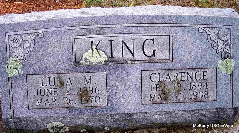 | KING, Lula M. (SMITH) | June 2, 1896 | Mar. 26, 1970 | SSW: Clarence - Research Note: Lula M. Smith, age 17, married Thomas Clarence King, age 19, on Aug. 6, 1913 in Wheaton, Barry Co., MO. H. S. King and D. J. Smith, parents, gave consent. Daughter of David Jesse Smith, buried at Purdy Cemetery and Julia Howerton. | MO Marriage Records Phyllis Long Photo Diana Cope |