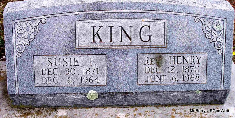 | KING, Henry Smith, Rev. | Dec. 12, 1870 | June 6, 1868 | SSW: Susie I. - Research Note: Henry Smith King, age 22, married Susan Riddle, age 21, on May 28, 1893 in Barry Co., MO. He was the son of Pleasant Henderson King and Virginia Catherine Moulden. | MO Marriage Records Census Phyllis Long Photo Diana Cope |