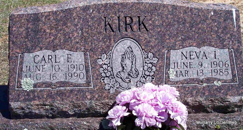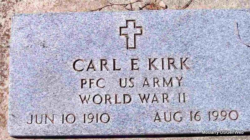 | KIRK, Carl Edward | June 10, 1910 | Aug. 16, 1990 | SSW: Neva I. - Research Note: Son of Craven C. Kirk and Bessie Mae Bufford. - Military Stone - Inscription: "PFC US ARMY WORLD WAR II" | Census Phyllis Long Photo Diana Cope |