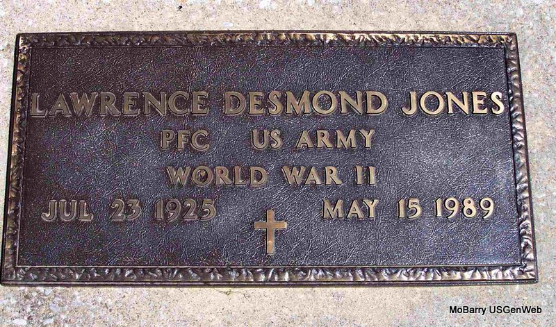 | JONES, Lawrence Desmond | July 23, 1925 | May 15, 1989 | Inscription: "PFC US ARMY WORLD WAR II" - Research Note: He was the son of James M. Jones and Amanda Montgomery. His wife was Margaret Elizabeth Sexton. | Census SS Claims Index Phyllis Long Photo Diana Cope |