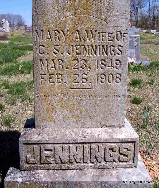 Inscription: "Wife of C. S. Jennings" - Research Note: Cassville Democrat, March 6, 1909 - Clark News: Died, Feb. 26th, five miles southwest of Purdy in the Clark district, Mrs. Mary Adeline Jennings, wife of Chas. S. Jennings. Mrs. Jennings was born March 23, 1849 at Buffalo, N. Y., being 50 years 11 months, and 3 days old. She was married July 12, 1868, at Twin Lake, Iowa. Eight children were born to them, five of who survive, one son and four daughters. She was converted and joined the United Brethren at the age of seventeen. The remains were laid to rest in Mount Pleasant Cemetery after services conducted by Brother Combs. - April 4, 1912, Thursday, Cassville Republican - C. S. Jennings on route 3 has returned from Centralia, Ill, where he had spent the winter. Centralia was Mr. Jennings old home. He had been away for forty years and found things pretty changed in that time. | Online Newspapers Phyllis Long Photo Diana Cope |