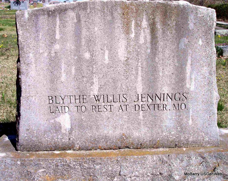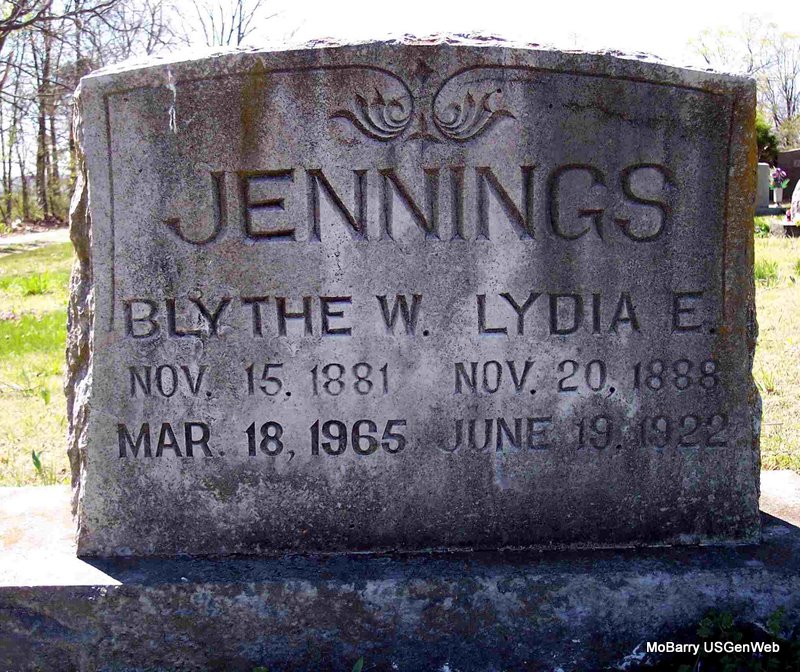 SSW: Lydia E. - Research Note: He was the son of Charles Skinner Jennings and Mary Adeline Duescher. He was divorced at the time of his death. Usual residence was Dexter, Stoddard Co., MO. Harry B. Jennings of Dexter, MO was the informant on the death certificate. - April 25, 1908, Saturday, Cassville Democrat - Purdy News: Married Sunday, April 12, B. W. Jennings and Miss Lydia Graber. - Cassville Republican, Thursday, Oct. 10, 1918 - Clark News: Mr. and Mrs. Blythe Jennings are the proud parents of a baby girl, born Wednesday, Oct. 2. Mother and babe are doing nicely. - Back of Stone - Inscription: "Blythe Willis Jennings laid to rest at Dexter, MO" | Census Online Newspapers Death Certificate Phyllis Long Photo Diana Cope |