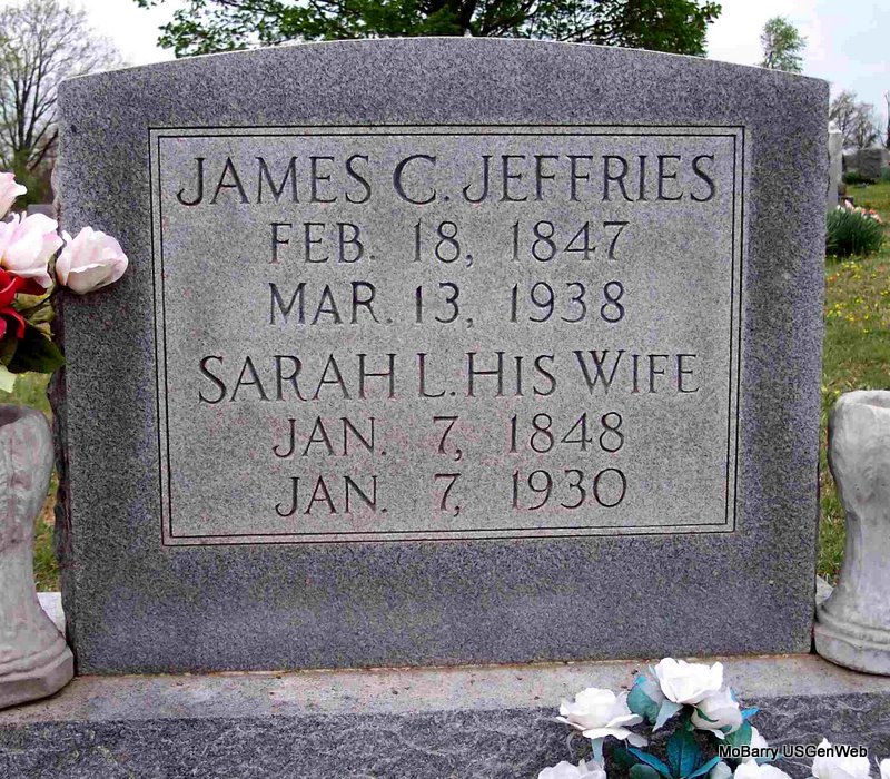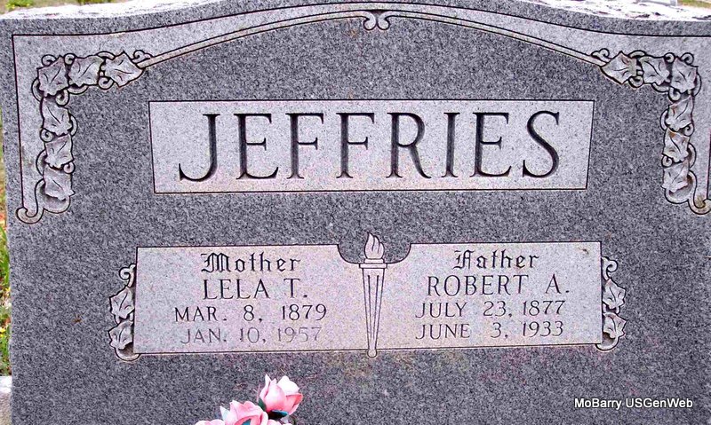 | JEFFRIES, Robert A. | July 23, 1877 | June 3, 1933 | SSW: Lela T. - Research Note: He was the son of James Calvin and Sarah Luvena Jeffries. He married at age 21, Lela T. Hays, age 19, on Sept. 25, 1898 in Barry Co., MO. | Census MO Marriage Records Phyllis Long Photo Diana Cope |