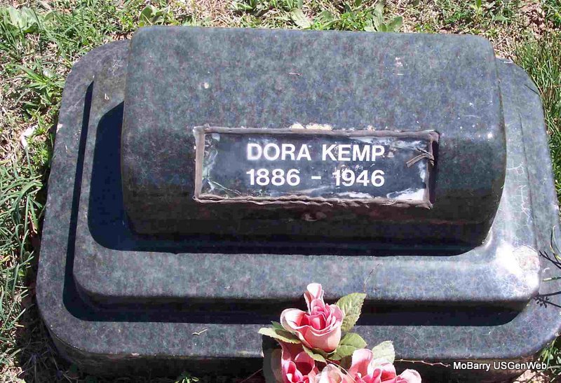 Research Note: Her Death Certificate gives her date of birth as Jan. 6, 1882. She was the wife of John Edwin Kemp. Daughter of Ed. Edwards born MS and Jane McDunner born AR. Cleo Duffey of Butterfield, MO was the informant on the death certificate. Dora first married August Cleo Duffy, buried at Mt. Pleasant Cemetery. | Death Certificate Phyllis Long Photo Diana Cope |
