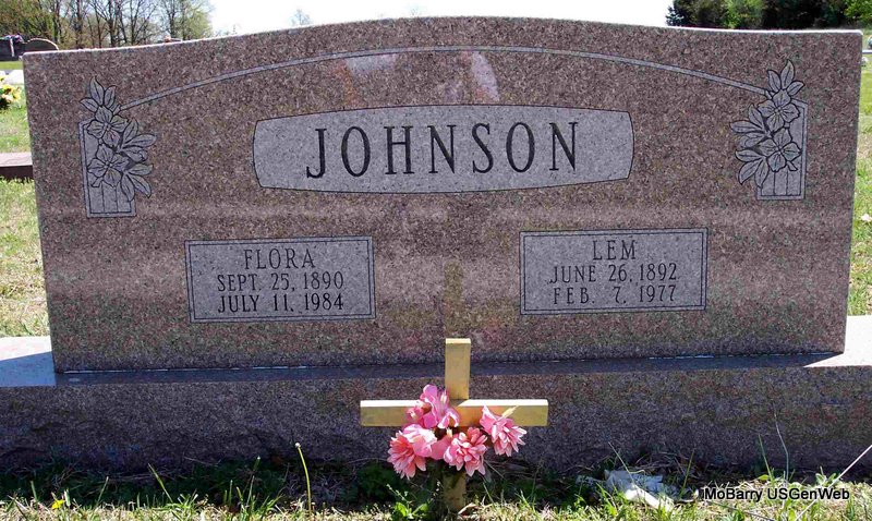 | JOHNSON, Lem | June 26, 1892 | Feb. 7, 1977 | SSW: Flora - Research Note: He was a son of William M. and Martha (Thrasher) Johnson. - November 25, 1915, Thursday, Cassville Republican - State vs. Lem Johnson, grand larceny, trial by jury, verdict of not guilty. - Aug. 31, 1916, Thursday, Cassville Republican - Gunter: Bud and Lem Johnson were in our neighborhood last week looking for fat hogs. They were paying 9 cents per pound. - December 7, 1916, Thursday, Cassville Republican - Lem Johnson, 24, Purdy and Flora Amos, 24, Monett. - Cassville Republican, Thursday, Nov. 21, 1918 - Mrs. Flora Johnson is home at the bedside of her husband, Lem Johnson, who was thought to have the "flu". | Census Online Newspapers Phyllis Long Photo Diana Cope |
