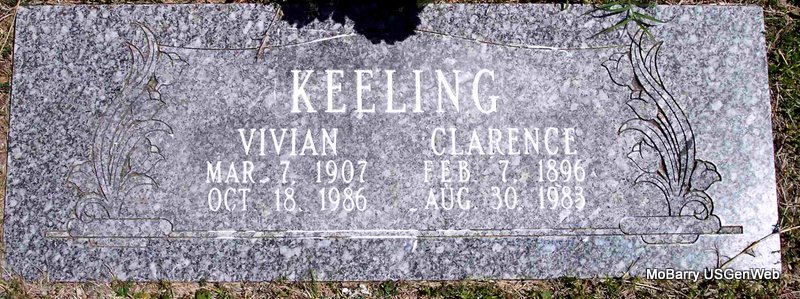 | KEELING, Vivian (McCLANAHAN) | Mar. 7, 1907 | Oct. 18, 1986 | SSW: Clarence Keeling - Research Note: She was the daughter of Valentine James McClanahan and Tessa Ella Highley. | Census Phyllis Long Headstone Kay C. Morrow Photo Diana Cope |