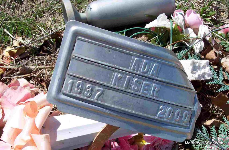 Research Note: Temporary Marker - She was the daughter of Clarence and Calista (Bossard) Vernoy. She received her education at Hornet School and moved to the Barry County Care Center in Cassville in 1997. She married Eugene Kiser on July 5, 1979, in Miami, OK. She was preceded in death by an infant daughter, Florence Kiser. Survivors include one son, living Lovell of Joplin, and three daughters. | Monett Times June 2, 2000 Mary Homesley Photo Diana Cope |