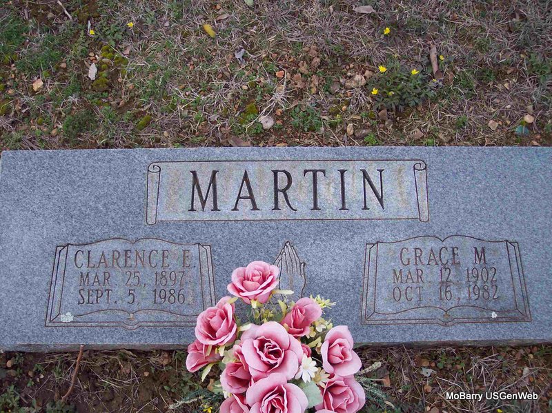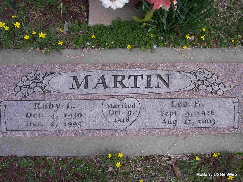 SSW: Ruby L. - Inscription: "Married Oct 9, 1948" - Research Note: He was the son of Clarence and Grace (Tharp) Martin. He was retired from Alltel and Barry County Mutual Insurance Company. He was a member of the First Christian Church in Purdy, where he was an Elder and Sunday school superintendent and treasurer. He married Ruby McCracken on October 9, 1948, in Berryville, Arkansas, and she preceded him in death December 2, 1995. Also preceded in death by one daughter, Janet Martin; and one granddaughter, Sara Goade. | Monett Times Phyllis Long Photo Diana Cope |