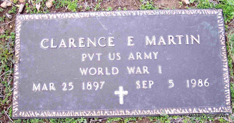SSW: Grace M. - Research Note: WWI Draft Reg. gives his name as Clarence Ernest Martin of Princeton, Franklin Co., KS. His employer was Clayton Martin and nearest relative was his father Henry Martin born IN. He was the son of Henry Martin and Nancy Emiline Walter. - Military Stone - Inscription: "PVT US ARMY WORLD WAR I" | WWI Draft Reg. Census Phyllis Long Photo Diana Cope |