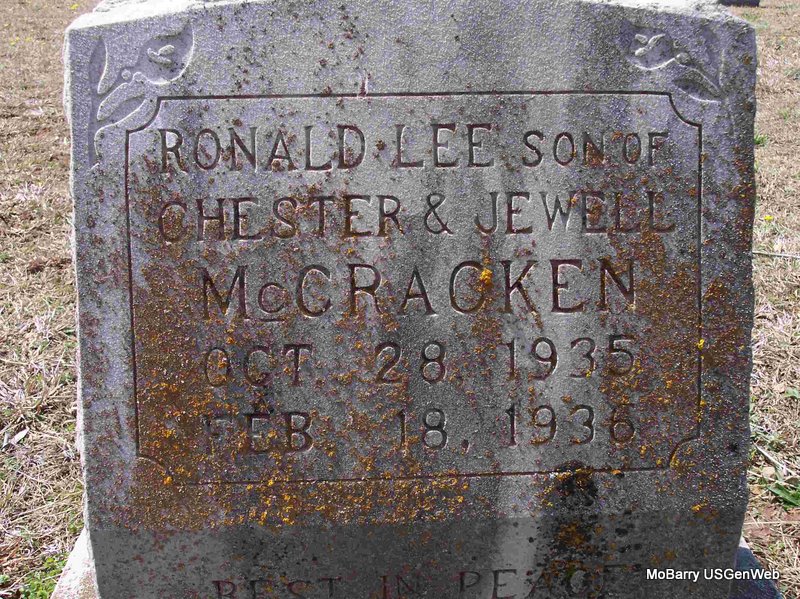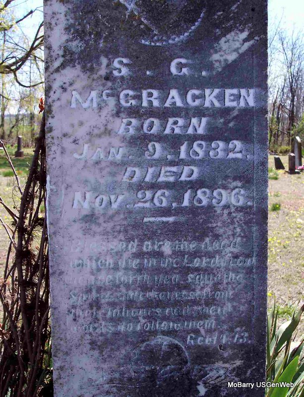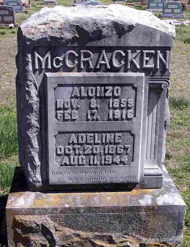 SSW: Mary Adeline - Research Note: Alonzo was a son of Samuel George and Bethena (Boren) McCracken - Cassville Republican, March 2, 1916 - We are deeply grateful to all of our neighbors and friends of their kind acts and sympathy at the death of our beloved husband and father, Alonzo McCracken. May God bless you all and may such a grief never be yours to experience. Mrs. A. L. McCracken, Fannie, James, Ira, Maud and families, Margaret, Earl, Purl, Finace, Ona and Chester. | Online Newspapers Phyllis Long Photo Diana Cope |