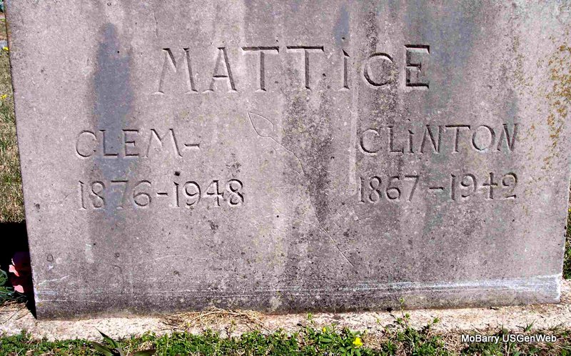 SSW: Clem - Research Note: He was a RR conductor and married to Clementine Mattice. Son of Alex Mattice and Amelia Thatcher both born NY. Death certificate says he was buried at New Hope Cemetery which is incorrect. - Cassville Republican, Nov. 9, 1939 - Mr. and Mrs. George Page of Cassville visited Sunday with Mr. and Mrs. C. Mattice. - Same paper: M. L. Bond of Hamburg, Ark., Mrs. Edgar Campbell and Mrs. Minnie Harris of LA, visited the past week at the home of C. Mattice. | Death Certificate Online Newspapers Phyllis Long Photo Diana Cope |
