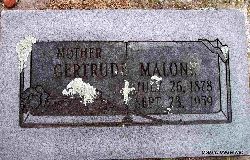 Inscription: "Mother" - Research Note: She was the second wife of Albert M. Malone. - 1930 Census, Missouri, Barry, Liberty, District 12 - Albert M. Malone, age 61, born PA, parents born PA; Gertrude M., wife, age 51, born OH, father born NC, mother PA; A. Raymond, son, age 28, born OH; Melba, daughter, age 24, born OH, public school teacher. She was the daughter of Jonathan Morris and Leah Gardner. | Census Death Certificate Phyllis Long Photo Diana Cope |