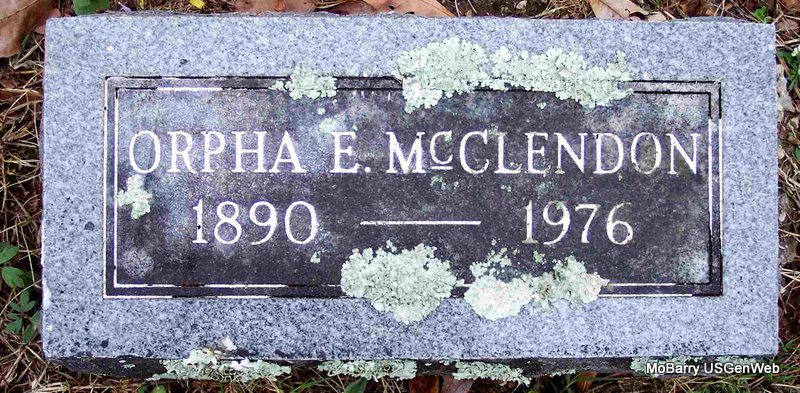 | MCCLENDON, Ophra E. (REED) | 1890 | 1976 | Research Note: Daughter of Jonathan Reed and Mary Elizabeth (Riddle) (Reed) (McClendon) Hite. She first married James Ara McClurg and they divorced. - Circuit Court Proceedings, Feb. 27, 1909, Barry Co., MO - Oprha M. E. McClurg vs. Jas. A. McClurg; decree for plaintiff with care and custody of child. - She married Ulysses Grant McClendon and Jacob C. McClendon Jr., brother to Ulysses Grant. - Mary Edith (McClendon) Davis's death certificate gives her mother as Orpha Reed and her father as Ulysses Grant McClendon. - Jacob McClendon of Cochise Co., AZ married Orpha E. McClendon of Purdy, Barry Co., MO on Mar. 9, 1918 in Joplin, Jasper Co., MO. - Cassville Republican, March 20, 1919 - Pleasant Valley news - Ophra McClendon of Hockerville, Okla., is here caring for her mother, Mrs. Jim Hite, who is seriously ill at this writing. | Census MO Marriage Records Online Newspapers Phyllis Long Photo Diana Cope |