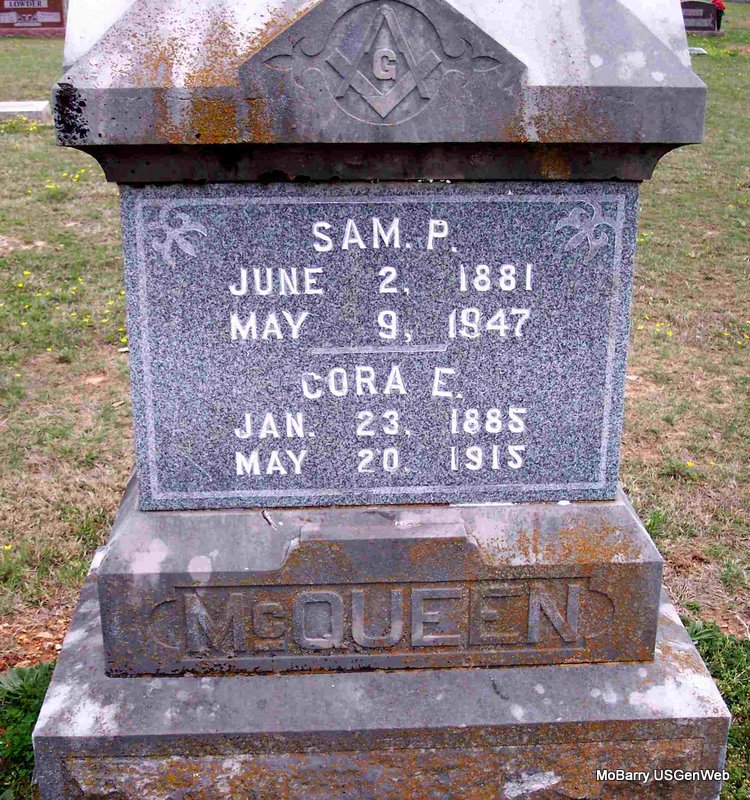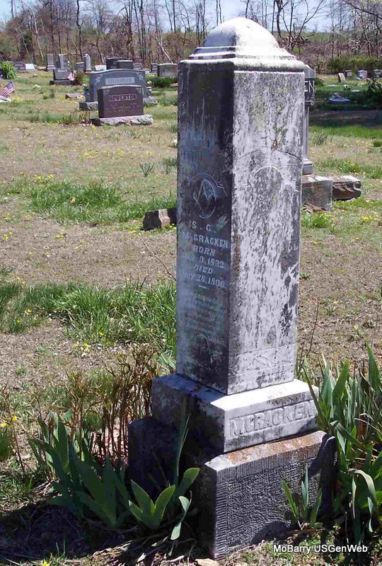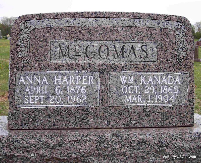| MCCOMAS, William Kanada | Oct. 29, 1865 | Mar. 1, 1904 | SSW: Anna Harper - Research Note: He was the son of George Washington McComas and Elmira Hadley. Husband of Charity Ann (Lane) (Harper). - Cassville Republican, April 12, 1900 - The little daughter of Canada McComas was badly burned about the breast and limbs by the upsetting of a bottle of Carbolic acid. | Headstone Cheryl Family Records Donna Cooper Online Newspapers Phyllis Long Photo Diana Cope |