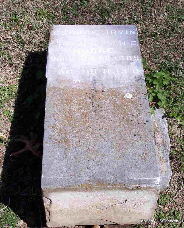 | MOORE, George Irvin | Abt. 1891 | Aug. 28, 1909 | Inscription: "Son of C. E. and M. E. Moore - Age 18 M and 13 D" - Another Photo | Photo Diana Cope |