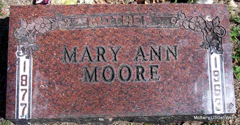 Research Note: 1900 Census gives her birth date as June 1838. Roberts given as her father's name, born TN. No name for her mother but born in TN. Mollie Morris of Pierce City, Lawrence Co., MO was the informant on the death certificate. - Cassville Democrat, April 19, 1929 - Mrs. Margaret L. Moore died at 8:45 o'clock Tuesday evening, April 2nd at the home of daughter, Mrs. Elizabeth Morris five miles north of Pierce City. Mrs. Moore was sick only five days. She had been in good health until this time, considering her age. She was born in Carroll County, Tenn. She was eight-six years of age. When she was seven years of age, she went with an uncle to Fulton Ky., where she made her home until her marriage to J. T. Moore at the age of seventeen. Mrs. Moore was the mother of thirteen children, four of who preceded her in death, Her husband J. T. Moore died April 17, 1911 at the age of 73 years. Until the last four months she had lived near Exeter coming there from Kentucky about eight years ago. Four months ago she moved to the home of her daughter, Mrs. Morris, where she was kindly cared for. She is survived by her nine children, who are Jeff Moore of Tulsa, Okla., Nana Pruitt of Shreveport, La., Ellen Herron of El Paso, Tex., Joe of Washington, Mrs. Morris of Pierce City, Docai Bandy of Neosho, Mrs. Stribling of Neosho, Charles Moore of Exeter and John of Rogers, Ark. | Death Certificate Online Obit Phyllis Long Photo Diana Cope |