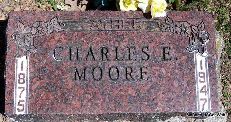 Research Note: His wife was Mary Ann Walde. Son of Joseph T. and Margarette (Roberts) Moore. Mary was the informant on the death certificate. They lived 6 miles NW of Exeter, MO. Cause of death was suicide. Shot himself with a 12 ga. shotgun in the left shoulder. He had been in ill health for some time. Charles is with the family in 1880 Census, Kentucky, Fulton Co., Fulton - 1900 Census, Missouri, Lawrence Co., Mount Pleasant - Charles E. Moore, head, born Aug. 1875 KY, age 24, married 1 year, father born TN, mother KY, farmer; Mary, wife, born Feb. 1872 Germany, age 18 married 1 year, mother of one child, living, parents born Germany; Opal M., daughter, born Mar. 1900, age 2 months; Joseph, brother, born Mar. 1867 KY, age 33, single, father born TN, mother KY, farm laborer. - Mother's Obit | Death Certificate Census Phyllis Long Photo Diana Cope |