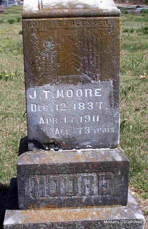 Inscription: "Age 73 years" - Research Note: He was married and a farmer. He was a son of Joe Moore and Sophia Carlson?. Margarette Moore (his wife) of Exeter, MO was the informant. - 1900 Census, Missouri, Barry Co., Liberty - Joseph T. Moore, head, born Dec. 1837 GA, age 62, married 39 years, parents born GA, farmer; Margarette, wife, born June 1838, age 61, born TN, mother of 13 children, 11 living, parents born NC; Thedosie, daughter, born May 1873 KY, age 27, single; John W., son, born June 1877 KY, age 22; James, son, born Dec. 1882 KY, age 17. | Census Death Certificate Phyllis Long Photo Diana Cope |