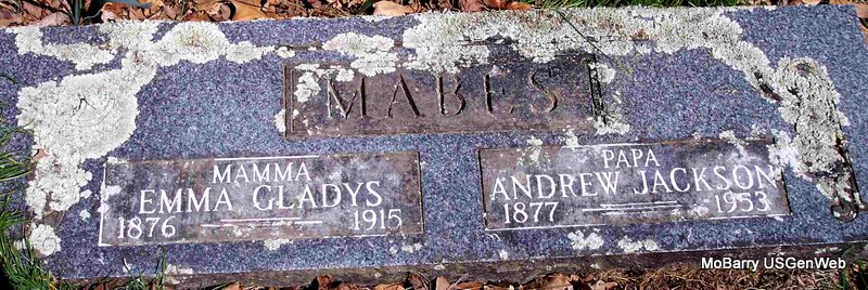 | MABES, Andrew Jackson | 1877 | 1953 | W: Emma Gladys - Research Note: Son of James Jackson and Elizabeth F. Mabes. - 1900 Census, Greenfield, Dade Co., Missouri - Jackson Mabes, age 23, born Apr. 1877 MO, married in 1897; Gladys, wife, age 23, born Feb. 1877 IA; Ray, son, born Apr. 1899 MO, age 1. - A. J. Mabes second married Mrs. Junie (Wood) Hutchison on Nov. 15, 1924. Junie was the widow of David Calvin Hutchison and died in 1926. - 1930 Census, Neosho, Newton Co., Missouri - Andrew is widowed and living with his son Ray, age 31 and his wife Pearl, age 30. | Census MO Marriage Records Phyllis Long Photo Diana Cope |