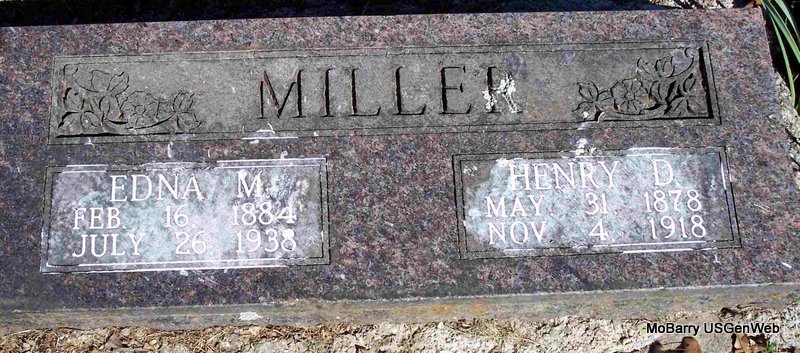 SSW: Edna M. - Research Note: He was the son of Jacob Miller and Eliza Ann Cole. - February 29, 1912, Thursday, Cassville Republican - Suburban News: J. H. W. Zilliox and Mr. Wolfenbarger broke the roads with a snow plow from H. D. Miller's to Cassville Thursday as the snow was very deep and two teams had to be used, it was done with a great deal of difficulty. - November 14, 1912, Thursday, Cassville Republican - Suburban News: H. D. Miller and Lon Wolfenbarger have made some nice concrete improvements about their homes this week. - December 28, 1916, Thursday, Cassville Republican - H. D. Miller who moved to Gravette, Ark., a year or so ago has returned to Barry county and is now located on his farm in Forest Grove neighborhood. - Cassville Republican, Thursday, Nov. 14, 1918 - Citizens of Butterfield township speak most highly of Henry Miller who died at his home in that township last week of influenza. | Census Online Newspapers Phyllis Long Photo Diana Cope |