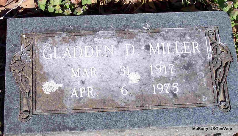 | MILLER, Gladden David | Mar. 31, 1917 | Apr. 6, 1975 | Research Note: He was the son of Henry David Miller and Edna Mae Packwood. SSDI gives his last address as Pierce City, Lawrence Co., MO. Researchers say he was married to Gwendolyn Arvilla Henderson. She second married William Phelps. She died in 2010. From her obit: She united in marriage to Gladden Miller May 2, 1936 and then later to William Phelps January 14, 1961. William preceded her in death November 18, 2002. Buried at Arnhart Cemetery. | Census SSDI Phyllis Long Photo Diana Cope |