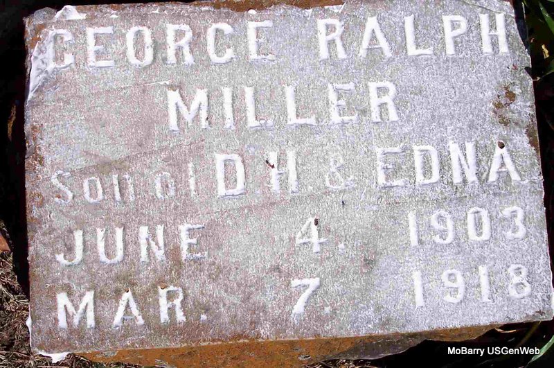 | MILLER, George Ralph | June 4, 1903 | Mar. 7, 1918 | Inscription: "Son of D. H. and Edna" - Research Note: Son of Henry David Miller and Edna Mae Packwood. | Note Phyllis Long Photo Diana Cope |
