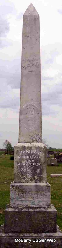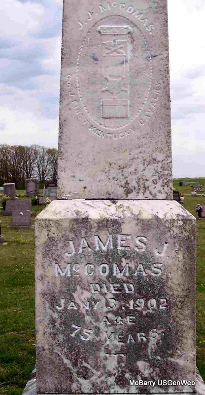 Jan. 3, 1902 | Inscription - "Age 75 years" - Research Note: James was probably a brother of George W. McComas 1833-1911 The census records indicate that James lived in Monroe and Cumberland Counties, KY. There appears to be no 1900 census record for him. But his Civil War pension file was transferred to the Western Office before 1900. James served with Company J 1st KY Cav Union and appears to have never married. - Another Photo | Headstone Cheryl Census Records Civil War Pension Record Stan McKay Photo Diana Cope |