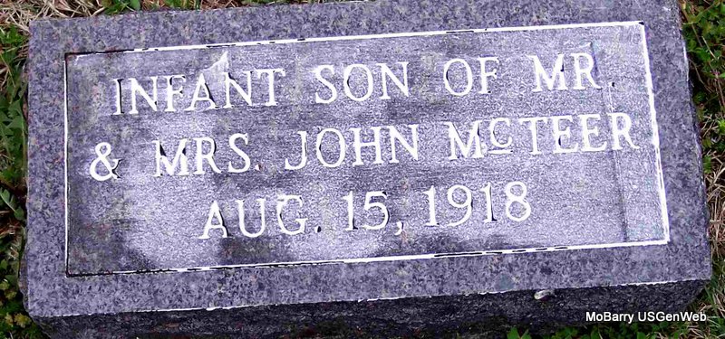 | MCTEER, Infant | No Date | Aug. 15, 1918 | Inscription: "Infant son of Mr. and Mrs. John McTeer" | Photo Diana Cope |