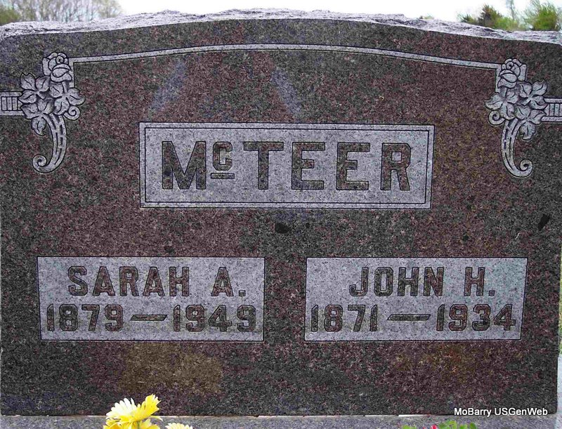 SSW: Sarah A. - Research Note: Very little information on the death certificate. His wife was named as Sarah and Gladys McTeer of Purdy, MO was the informant on the death certificate. - He married Sarah A. Tindle on Dec. 26, 1896 in Christian Co., MO. He was the son of James Martin McTeer and Mary Jane Gann. | Death Certificate MO Marriage Records Phyllis Long Photo Diana Cope |