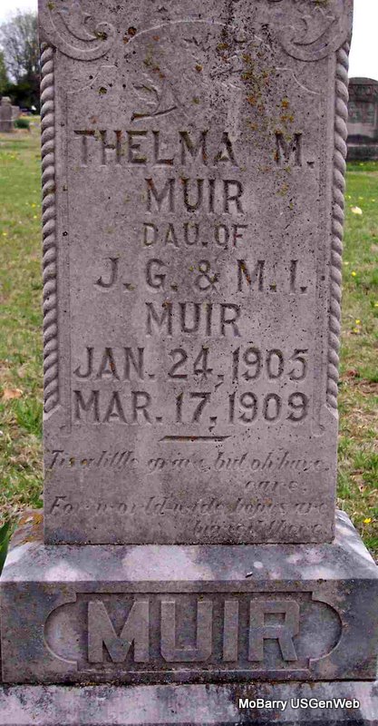 | MUIR, Thelma M. | Jan. 24, 1905 | Mar. 17, 1909 | Inscription: "Daughter of J. G. and M. L." | Photo Diana Cope |